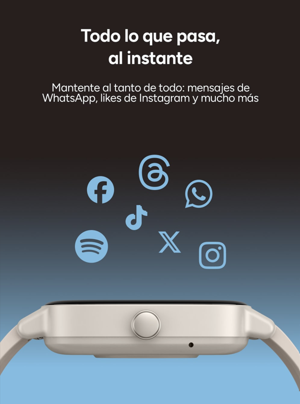 Recibe llamadas, mensajes y notificaciones al instante para estar siempre conectado. Controla tu música y usa asistentes de voz como Google Assistant, Amazon Alexa o Siri para simplificar tus tareas. Consulta el pronóstico del tiempo, encuentra tu móvil con un solo toque, personaliza tu pantalla e incluso toma fotos al vuelo desde tu smartphone con solo pulsar un botón.