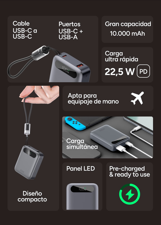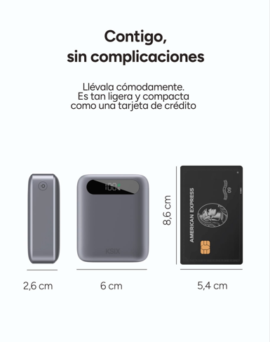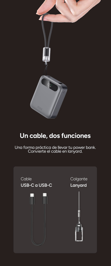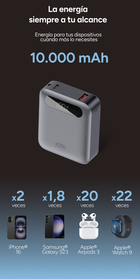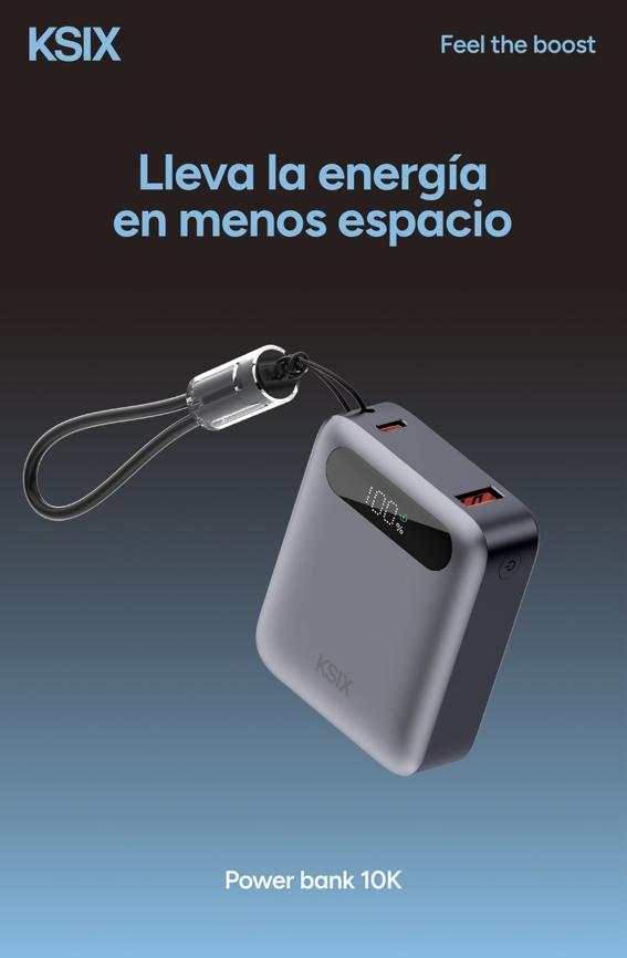 La power bank KSIX de 10.000 mAh es la solución perfecta para cargar tus dispositivos en cualquier momento y lugar. Con una potencia de salida de hasta 22,5 W y tecnología Power Delivery 3.0 y Quick Charge, ofrece carga rápida para que no tengas que esperar. Su diseño compacto y ligero la convierte en el accesorio ideal para llevar siempre contigo. Además, incluye un cable USB-C a USB-C que se convierte en un lazo para que la puedas colgar y mover con mayor comodidad.