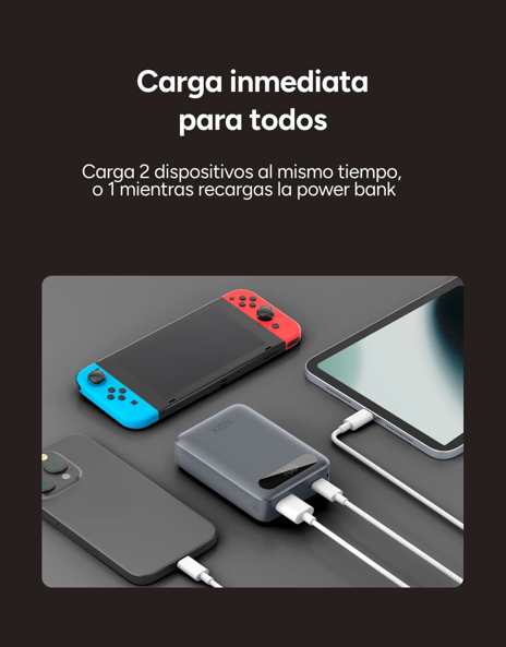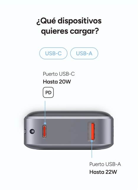 Equipada con puertos USB-C y USB-A, esta power bank permite cargar dos dispositivos al mismo tiempo, optimizando el uso de energía y brindándote mayor comodidad.