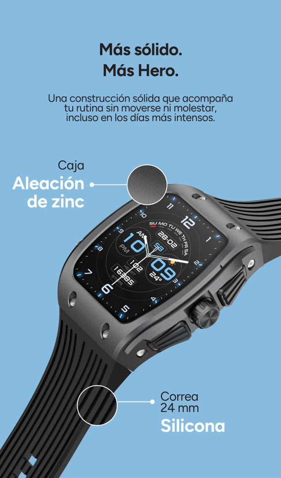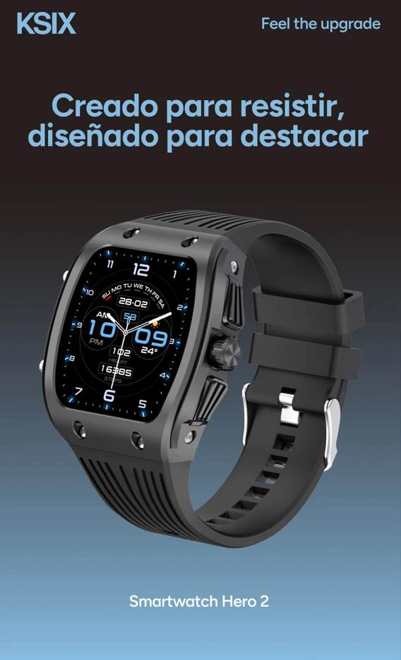 Hero 2 representa la versión con más presencia de la gama KSIX, pensado para quienes buscan un smartwatch con carácter. Esta segunda generación mejora el diseño, reduce peso y afina acabados sin perder su identidad potente. Inspirado en relojes de gran impacto visual, su formato voluminoso transmite seguridad y confianza en la muñeca. Un reloj con carácter, presencia y personalidad para acompañarte con fuerza en cualquier momento.