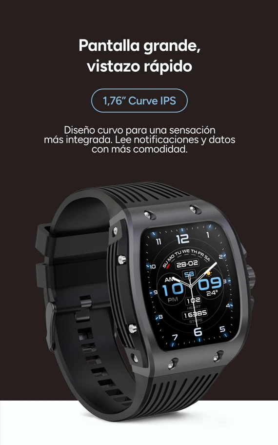 La pantalla IPS curva multitáctil de 1,76” ofrece una experiencia visual envolvente. Su resolución de 320 × 385 px permite consultar datos, notificaciones y gráficos de forma clara y ordenada. La superficie curva refuerza la sensación de inmersión y mejora la lectura de la información en el uso diario. Todo está pensado para que consultar el reloj resulte rápido y cómodo, tanto en interiores como al aire libre.