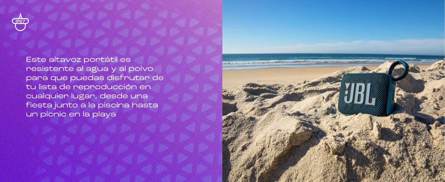 - El sol, la playa y tus altavoces impermeables según la norma IP67: llévatelos donde quieras; el compacto Go 4 es resistente al polvo y al agua, y cuenta con hasta 7 horas de tiempo de reproducción