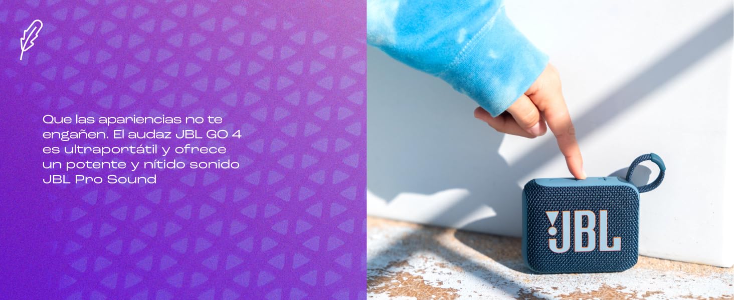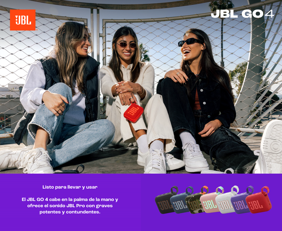 - Que el ritmo no pare: el JBL Go 4 con un llamativo diseño está a punto de convertirse en tu altavoz de uso diario; Ofrece un sonido JBL Pro nítido y alto con graves intensos e impactantes