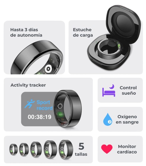 - Tiempo de carga: Anillo: 1 hora. Estuche de carga: 2 horas