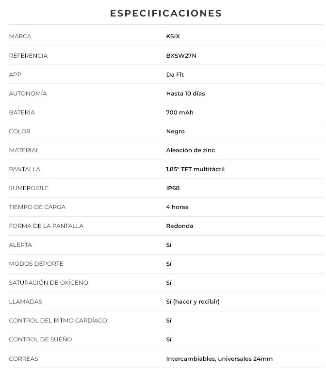 - Correa del smartwatch: 27,3 cm de longitud (incluyendo la caja) x 24 mm de ancho. Material: correa de silicona y hebilla de acero. Son correas universales 24 mm, extraíbles e intercambiables.