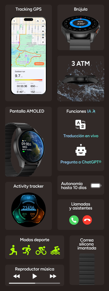 Habla directamente con tu smartwatch y obtén respuestas al instante gracias a la integración con ChatGPT. Solo formula tu pregunta por voz y el reloj te responderá con una locución clara y, además, con el texto en pantalla para que no te pierdas ningún detalle. Desde resolver dudas rápidas hasta obtener información útil para tu día a día, tendrás a tu propio asistente inteligente siempre a mano, sin necesidad de utilizar el móvil.