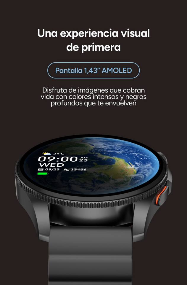 Contempla imágenes que cobran vida con la pantalla AMOLED de 1.43”: colores intensos y negros profundos que te envuelven, incluso bajo la luz directa del sol. Además, disfruta de la comodidad y ligereza del KSIX Horizon gracias a sus correas de siliconas imantadas, que se ajustan solas, y sus 70,8 g de peso. En definitiva, un diseño cuidado para que se vea bien… y se sienta mejor.