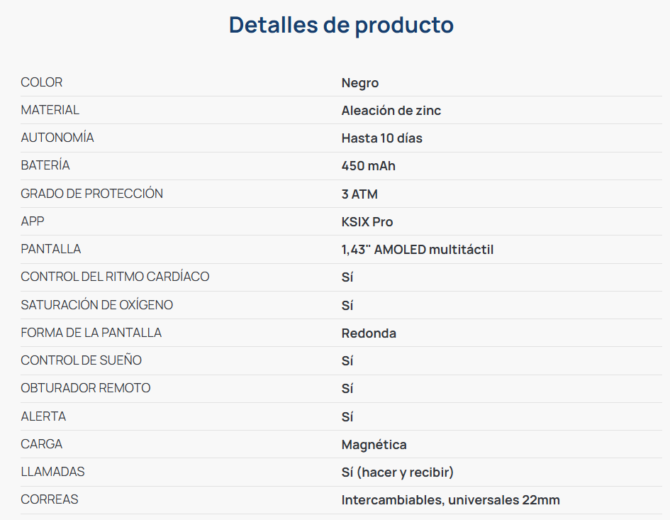 - Pantalla: 1,43”, 466 x 466 px, multitáctil. Material: Panda Glass.