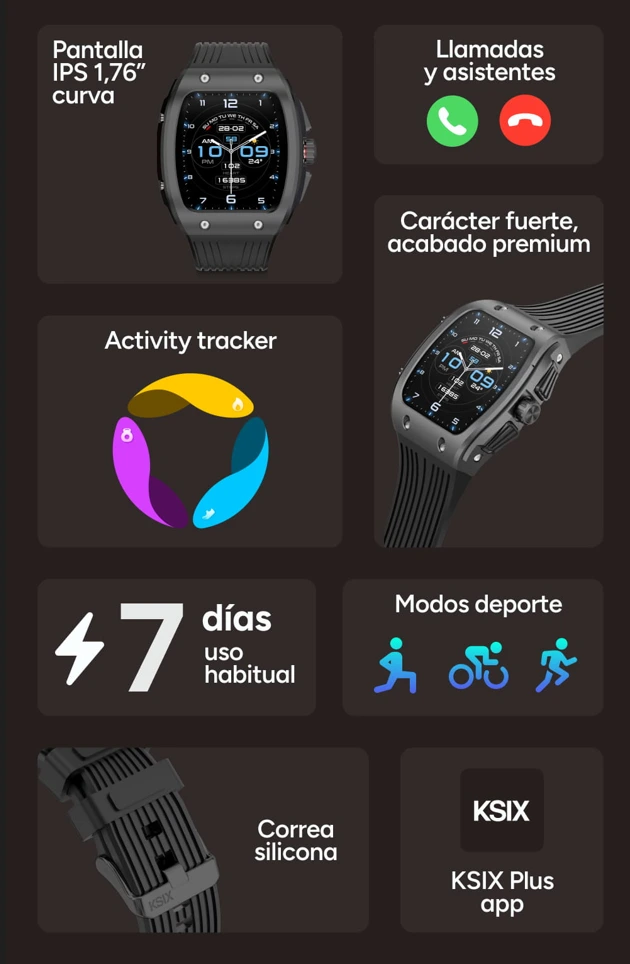 Hero 2 representa la versión con más presencia de la gama KSIX, pensado para quienes buscan un smartwatch con carácter. Esta segunda generación mejora el diseño, reduce peso y afina acabados sin perder su identidad potente. Inspirado en relojes de gran impacto visual, su formato voluminoso transmite seguridad y confianza en la muñeca. Un reloj con carácter, presencia y personalidad para acompañarte con fuerza en cualquier momento.