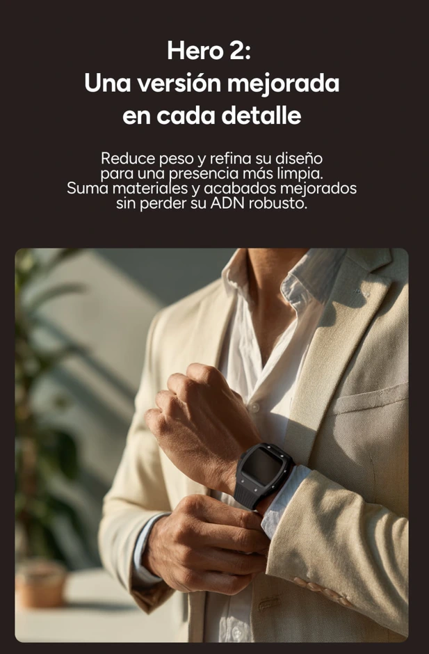 Hero 2 apuesta por una pantalla curva de formato ovalado y un diseño contundente que se hace notar desde el primer vistazo. La estructura se ha afinado para ofrecer una sensación más limpia y actual, manteniendo una estética sólida y bien definida. La caja de aleación de zinc transmite robustez, mientras que los botones laterales grandes facilitan el uso incluso en movimiento. La correa de silicona gruesa aporta una sujeción firme, cómoda y estable en movimiento.