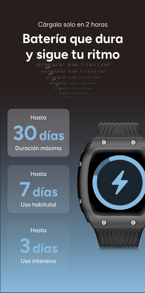 Con hasta 30 días de autonomía en reposo, hasta 7 días en uso normal y hasta 3 días intensivos, Hero 2 te acompaña gracias a su batería de 380 mAh. Está diseñado para un uso intenso sin depender continuamente del cargador. Su protección IP68 frente al agua y el sudor lo hace apto para entrenamientos exigentes, actividades al aire libre y jornadas largas. Un smartwatch resistente, diseñado para acompañar tu ritmo en cualquier plan, para que puedas seguir tu actividad, tu bienestar y tu evolución.