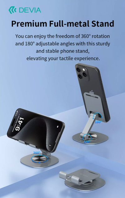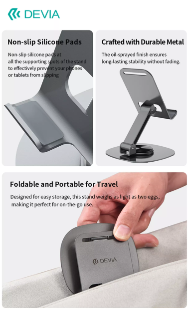 Hecho a mano de aleación de aluminio de alta calidad, silicona y plástico ABS, el soporte Devia es a la vez metálico y duradero. La construcción robusta garantiza longevidad y estabilidad, convirtiéndolo en un accesorio confiable para sus dispositivos. El soporte cuenta con una estera de silicona que protege su dispositivo de arañazos o deslizamiento. Además, la base ponderada con cuatro almohadillas de silicona antideslizantes mantiene el soporte estable sobre cualquier superficie plana, evitando caídas accidentales o resbalones.