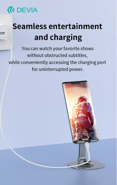 El innovador diseño hueco del soporte Devia le permite cargar su teléfono móvil mientras utiliza el soporte. Esta función es especialmente útil para leer, chatear o escribir, ya que garantiza que el dispositivo permanezca encendido sin interrupciones. El ancho del gancho está diseñado para adaptarse a todos los teléfonos inteligentes y tabletas, asegurando que la pantalla no se vea obstaculizada durante el uso.