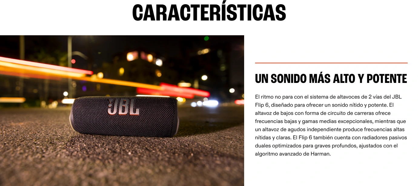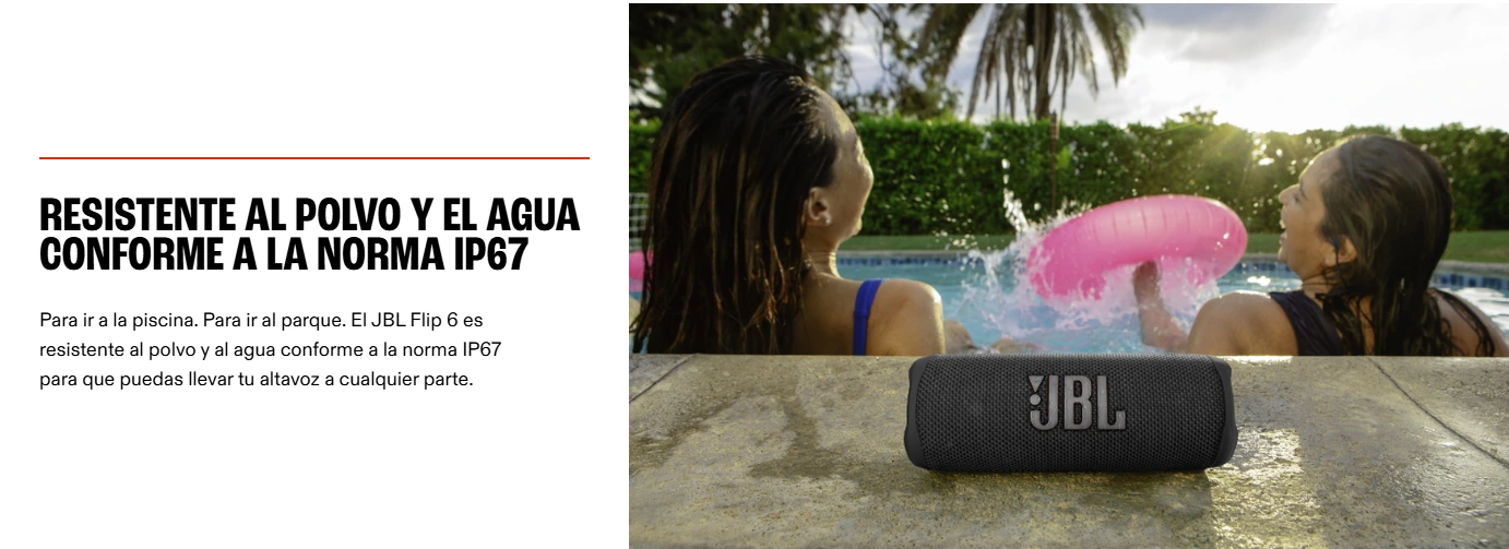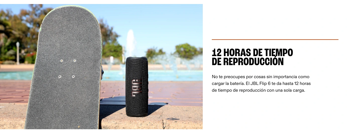 La banda sonora de tus aventuras El atrevido JBL Flip 6 ofrece el potente sonido JBL Original Pro con una claridad excepcional gracias a su sistema de altavoces bidireccionales, con un driver optimizado en forma de pista de carreras, un altavoz de agudos independiente y dos radiadores pasivos (uno a cada lateral). Este altavoz, además de ofrecerte el mejor sonido, es fácil de transportar y es resistente al agua y al polvo, por lo que puedes llevarlo a cualquier parte, sin importar el tiempo que haga. Y con 12 horas de batería, puedes irte de fiesta desde el amanecer al anochecer, allá donde te lleve la música. Usa PartyBoost para conectar varios altavoces compatibles. El Flip 6 está disponible en una gran variedad de colores.