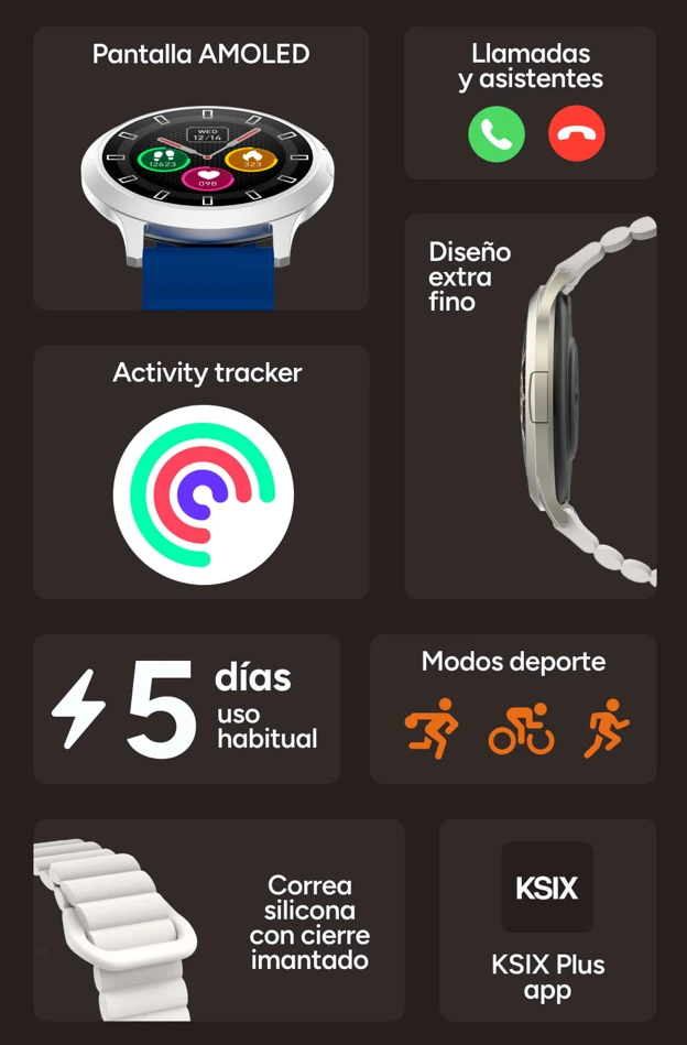 Core 3 se gestiona fácilmente desde la app KSIX Plus, donde puedes consultar tus datos y ajustar la experiencia a tu manera. Es compatible con smartphones Android® e iOS®, y permite sincronizar información con Apple® Salud, Google® Health y con aplicaciones externas como Strava.