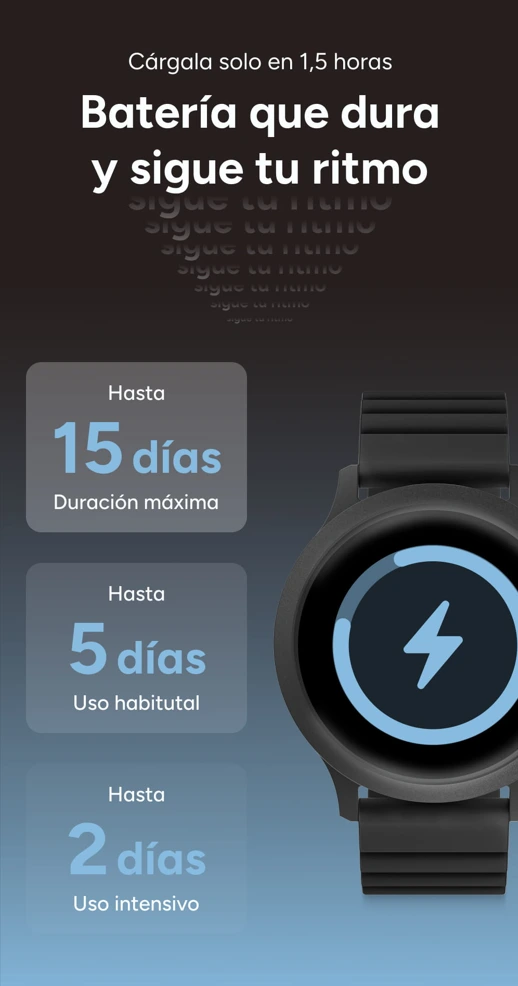 Core 3 ofrece hasta 15 días en modo reposo, hasta 5 días de uso normal y hasta 2 días de uso intensivo, gracias a su batería de 200 mAh que te permite olvidarte del cargador durante la semana. Está preparado para acompañarte en entrenamientos, desplazamientos y jornadas largas con su resistencia IP67 frente al agua y el sudor. Un smartwatch preparado para acompañar tu ritmo diario, para que puedas centrarte en lo que haces sin preocuparte por la batería y para que puedas seguir tu actividad, tu bienestar y tu evolución.