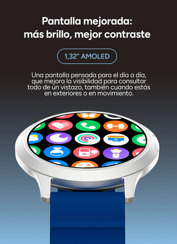 La pantalla AMOLED de 1,32” marca la diferencia en Core 3. Su resolución de 360 × 360 px ofrece una imagen clara y bien definida, con negros profundos y colores vivos que hacen que todo se vea mejor. El diseño curvo se integra de forma natural con el cuerpo del reloj, reforzando una sensación visual limpia y continua. Consultar la hora, tus datos o una notificación resulta rápido y cómodo, con una pantalla pensada para mirarla muchas veces al día.
