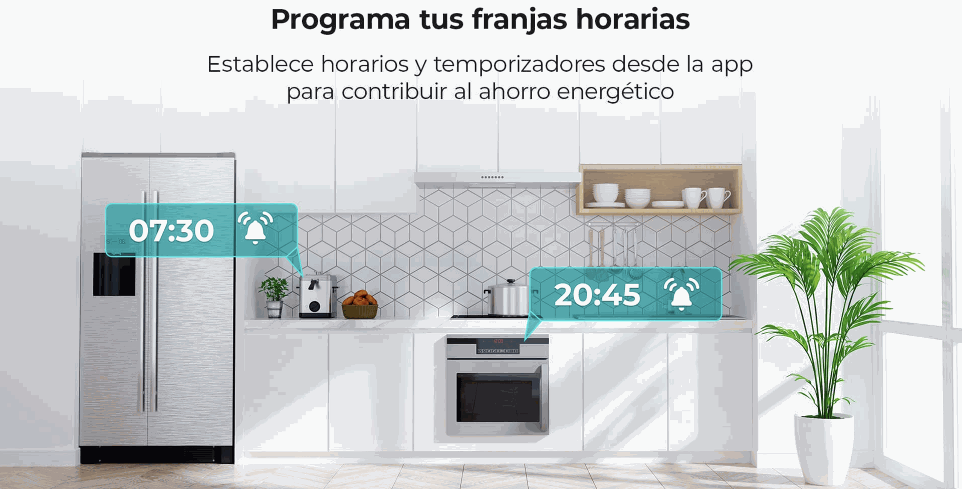 - Conexión inalámbrica para apagar y encender aparatos eléctricos de manera remota. Programador semanal y temporizador para programar el encendido y apagado automático de los dispositivos