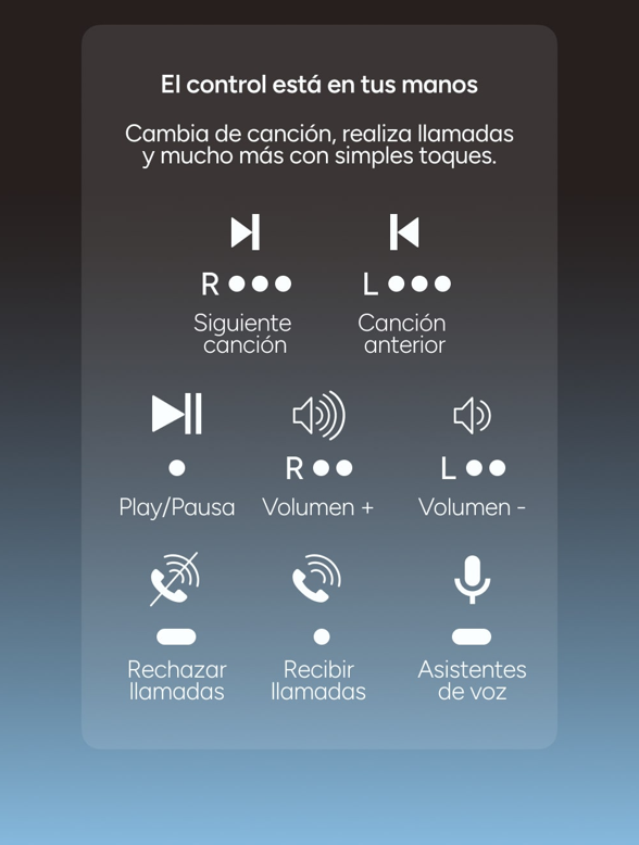Cambia de canción con un solo toque y disfruta de tu música sin distracciones. Atiende o rechaza llamadas de forma rápida y cómoda, sin necesidad de sacar el móvil. Activa tu asistente de voz al instante y gestiona recordatorios o mensajes sin mover un dedo. Todo el control que necesitas, al alcance de tu mano, o de tu voz.