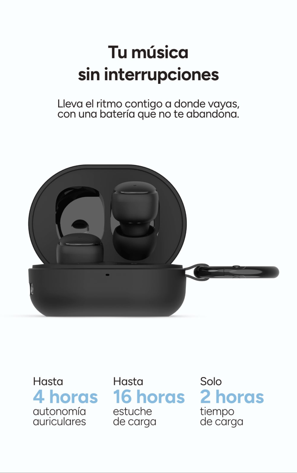 Los auriculares inalámbricos Neutron redefinen la movilidad con su diseño ultracompacto y ligero, sin sacrificar calidad de sonido ni funcionalidad. Perfectos para quienes buscan libertad total, combinan comodidad, control intuitivo y una autonomía que te acompaña durante todo el día. Además, su estuche con mosquetón te permite sujetarlos fácilmente a tu mochila, cinturón o llavero, para que los lleves contigo a todas partes sin preocuparte por perderlos. Ya sea para entrenar, viajar o trabajar, Neutron es tu compañero ideal en cualquier momento y lugar.
