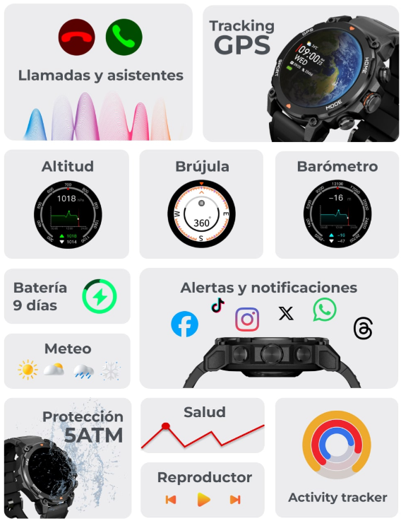 Explora lo desconocido con tu smartwatch KSIX Explorer y su GPS integrado. Llama y recibe llamadas usando el micro y altavoz interno. Recibe notificaciones de tus apps y consúltalas desde la pantalla AMOLED de 1,43”. Monitorea tu salud las 24 horas durante tus aventuras o tus entrenos. ¿Preparando una travesía larga? Gracias a los 9 días de autonomía del Explorer no te harán falta atajos. Y si eres de los que prefieren las aventuras acuáticas, el Explorer soporta hasta 5ATM. ¿Qué habrá más allá del horizonte? ¡Vamos a descubrirlo!