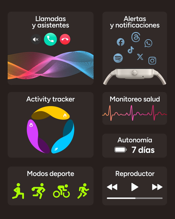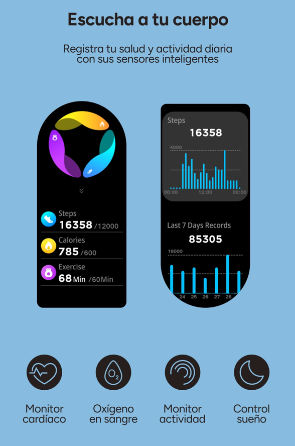 ¡Un aliado que va siempre contigo! Este smartwatch monitoriza con precisión tu frecuencia cardíaca, nivel de oxígeno en sangre, actividad física y calidad del sueño, entre otros, ofreciéndote datos claros y constantes.