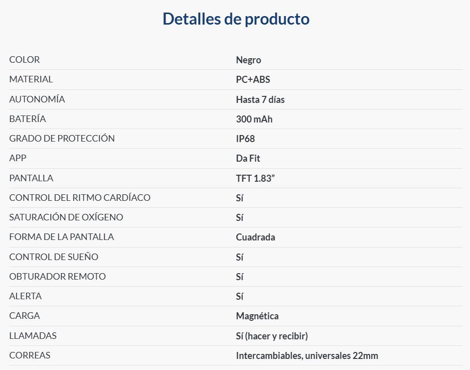 - Correa: 26,8 cm de longitud (incluyendo la caja) x 2,2 cm de ancho. Material: Silicona + hebilla de acero inoxidable. Son correas universales de 22 mm, extraíbles e intercambiables.