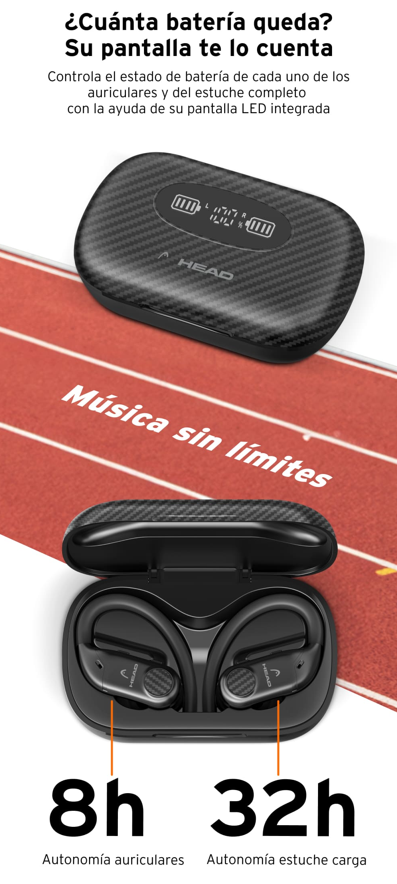 No sabemos cuántos maratones seguidos piensas hacer, pero los auriculares inalámbricos HEAD Flex Hooks te aseguran poder escuchar música o contestar llamadas durante tu hazaña. Los auriculares tienen una autonomía de 8 horas, y el estuche ofrece otras 32. ¡40 horas de autonomía en total!